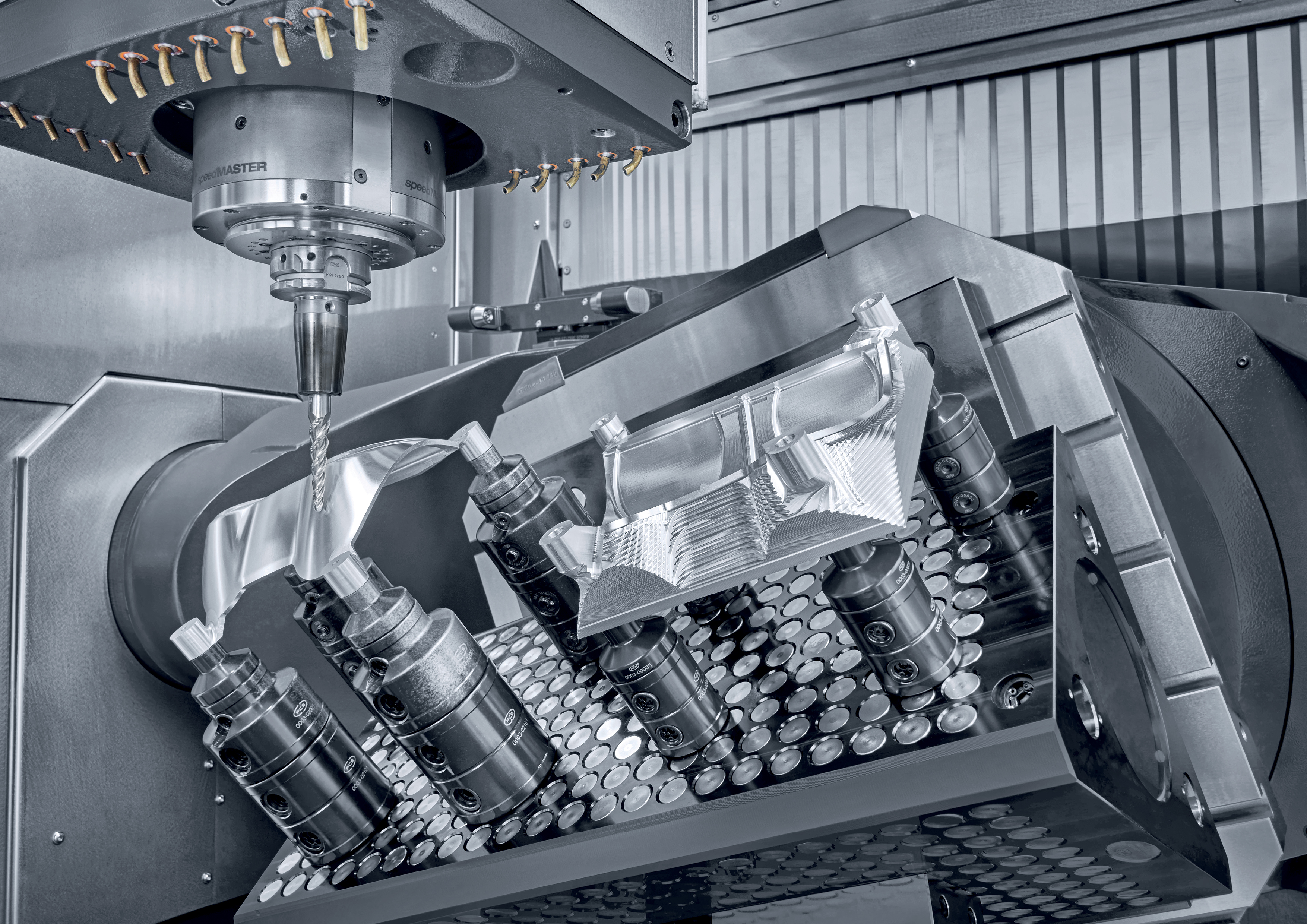 第二代DMC 65 monoBLOCK加工中心可选不同的主轴,适配客户特有的应用需求。可选范围包括转速达30,000 rpm的主轴,或扭矩达200 Nm的主轴。MASTER主轴的质保期达36个月,且无工作时间限制,设备可用率超过96%。第二代DMC 65/75 monoBLOCK加工中心搭载240刀位刀库,有效缩短非生产性时间,包括单件多品种和小批量生产时。第二代DMC 75 monoBLOCK加工中心搭载转速达20,000 rpm的speedMASTER主轴(35 kW,130 Nm),配置高,性价比高。其它配置还包括60刀位刀库和机床防护控制(MPC)技术循环。